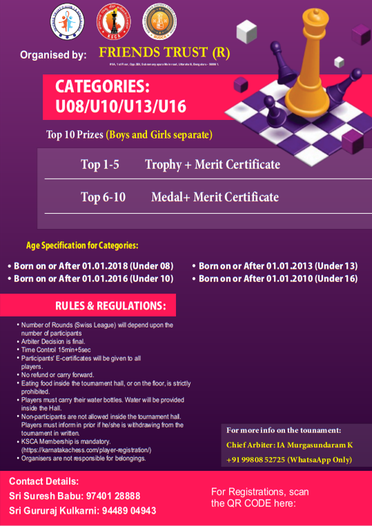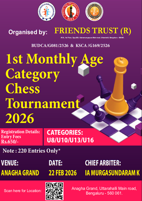 1st Monthly Age Category Chess Tournament 2026By admin / December 31, 2025 Entry Fees: ₹ 650 Categories: U8/U10/U13/U16 Venue: Anagha Grand, Near Arehalli Arch, Bengaluru-560061 Date: 22 FEB 2026