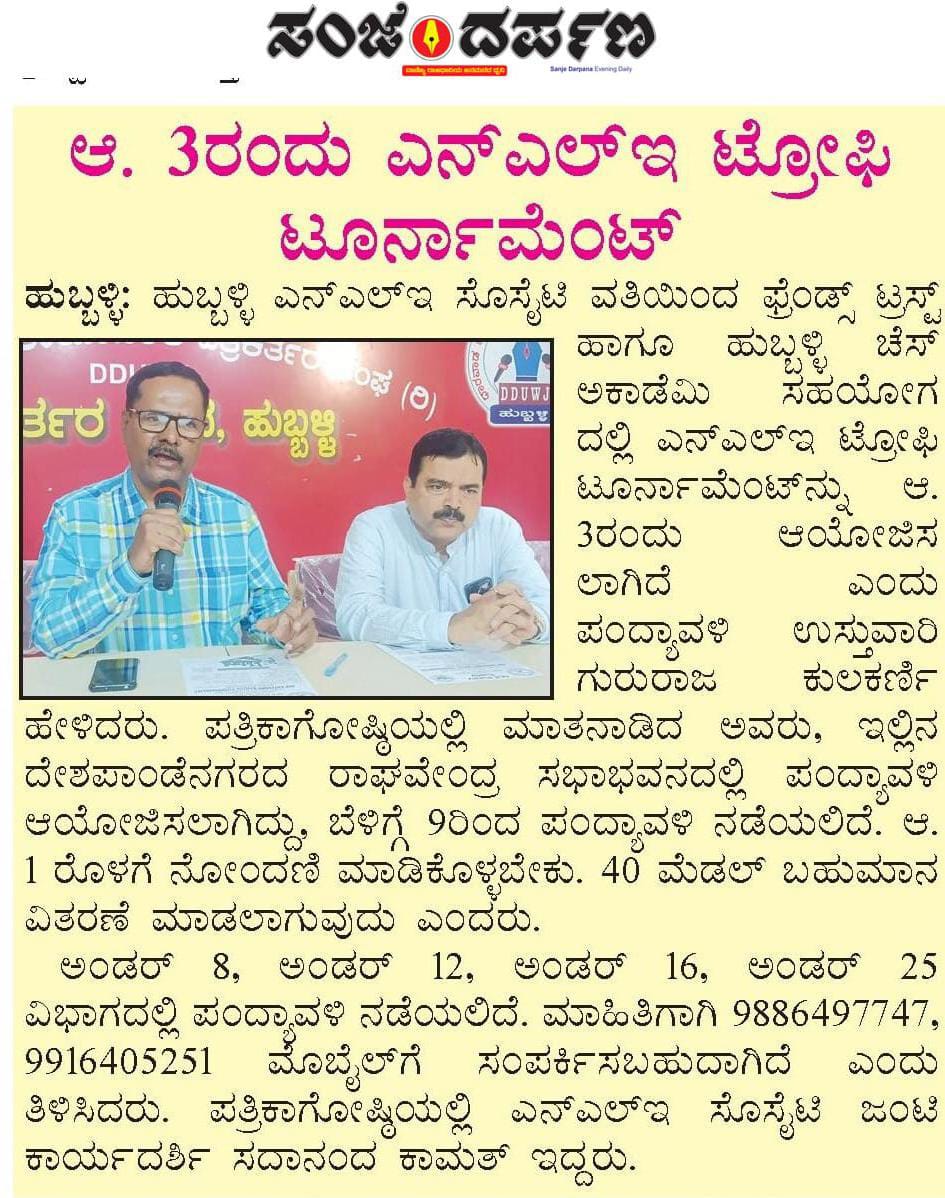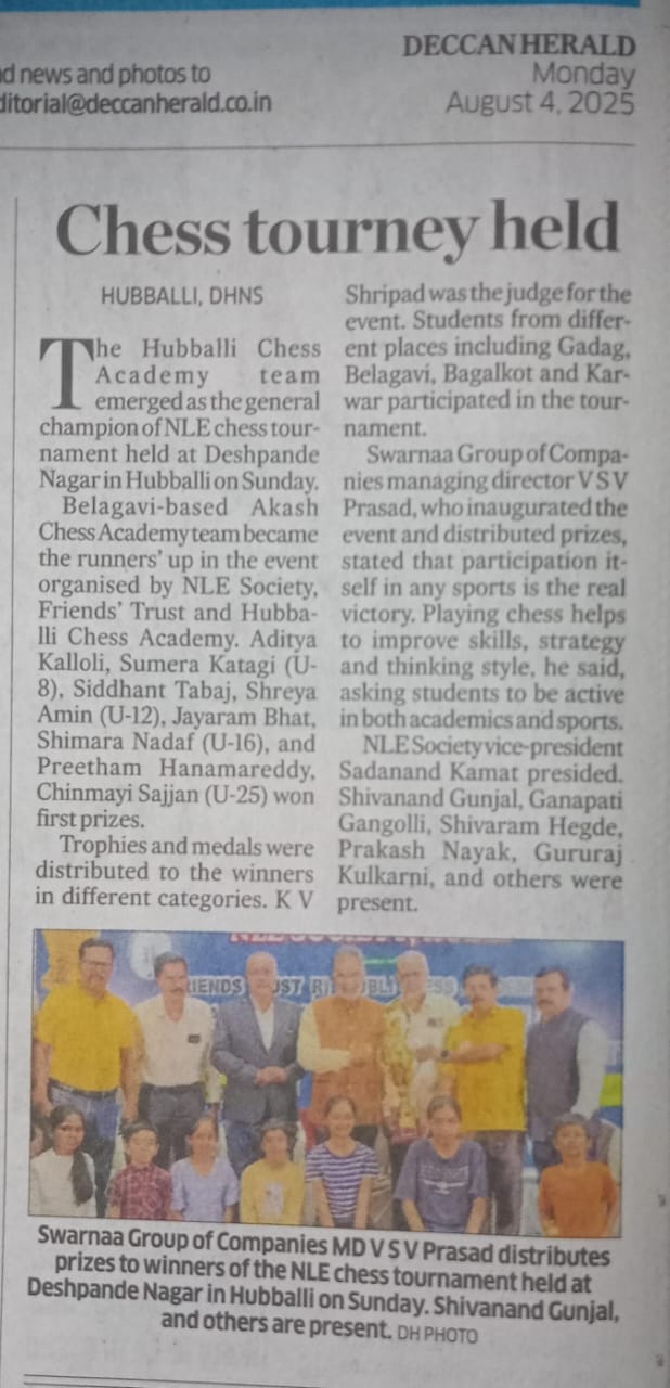 The NLE ROTARY CHESS TOURNAMENT was organized by FRIENDS TRUST in association with NLE Society and SWARNAA CHARITABLE TRUST, Hubballi.